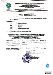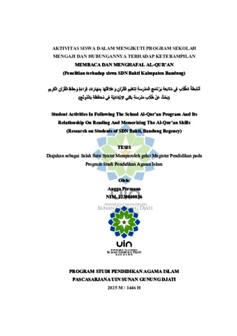 Permana, Angga (2025) Aktivitas Siswa dalam mengikuti program Sekolah Mengaji hubungannya terhadap keterampilan membaca dan menghafal Al-Qur’an : Penelitian terhadap siswa SDN Bakti Kabupaten Bandung. Masters thesis, UIN Sunan Gunung Djati Bandung.