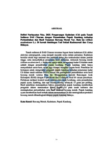 Tanah sedimen di DAS Citarum tercemar logam berat kadmium (Cd) akibat aktivitas antropogenik, yang menjadi masalah serius dalam pertanian. Kadmium bersifat toksik bagi tanaman dan makhluk hidup jika terakumulasi dalam jumlah tinggi, serta menyebabkan penurunan hasil pertanian, termasuk bawang merah (Allium ascalonicum L.). Salah satu upaya untuk mengurangi kadar Cd dalam tanah adalah dengan penambahan pupuk kandang. Pupuk kandang tidak hanya menyediakan unsur hara, tetapi juga mampu mengikat logam berat. Penelitian ini bertujuan untuk mengetahui pengaruh pupuk kandang terhadap penurunan kadar Cd dalam tanah sedimen DAS Citarum dan peningkatan pertumbuhan serta hasil bawang merah varietas Batu Ijo. Menggunakan metode Rancangan Acak Kelompok (RAK) dengan 8 perlakuan dan 4 ulangan, total 64 satuan percobaan. Perlakuan meliputi kontrol tanah sedimen dan tanah Lembang, serta penambahan pupuk ayam, kambing, dan sapi masing-masing sebanyak 15 gram per polibag. Hasil penelitian menunjukkan bahwa penambahan pupuk kandang memberikan pengaruh dalam menurunkan kadar logam Cd pada tanah sedimen dan meningkatkan pertumbuhan serta hasil tanaman bawang merah. Pupuk kandang ayam memberikan hasil terbaik dalam menurunkan Cd dan meningkatkan produksi bawang merah dibandingkan dengan pupuk kandang lainnya.