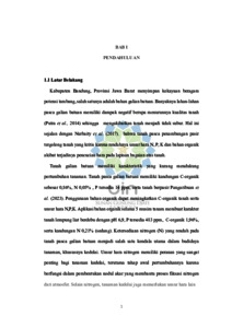 INDONESIA: Lahan pasca galian batuan di Indonesia memiliki potensi untuk dimanfaatkan dalam produksi pertanian. Namun kandungan unsur hara yang terbatas terutama N dapat dimanfaatkan dengan menggunakan bahan organik berupa pupuk kandang ayam dan bakteri rhizobium yang diharapkan mampu untuk meningkatkan nodulasi dan ketersediaan N. Tujuan dari penelitian ini adalah untuk mengetahui interaksi antara pupuk kandang ayam dan bakteri rhizobium dalam meningkatkan nodulasi, ketersediaan N dan produktivitas kedelai (Glycine max (L.) Merril) pada tanah pasca galian batuan serta mengetahui aplikasi pupuk kandang ayam dan bakteri rhizobium manakah yang paling berpengaruh dalam meningkatkan nodulasi, ketersediaan N serta produktivitas kedelai (Glycine max (L.) Merril) pada tanah pasca galian batuan. Metode yang digunakan dalam penelitian ini adalah Rancangan Acak Kelompok Faktorial 2 faktor, 8 taraf perlakuan, dan 3 kali ulangan. Faktor pertama terdiri dari 4 taraf yaitu Pupuk Kandang Ayam (b0 : Kontrol, b1 : 15 g polybag-1, b2 : 30 g polybag-1, dan b3 : 45 g polybag-1), faktor kedua terdiri dari 2 taraf yaitu bakteri rhizobium m0 : kontrol, dan m1 : 10 g kg-1. Pupuk kandang ayam dan bakteri rhizobium dapat meningkatkan c-organik dan n tersedia dalam tanah, diameter nodul akar efektif, serta hasil tanaman kedelai. Pupuk kandang ayam 15 t ha-1 memberikan pengaruh terbaik terhadap c-organik, n tersedia dalam tanah serta hasil pada tanaman kedelai begitu pula dengan penambahan 10 g kg-1 bakteri rhizobium. ENGLISH: Post-rock excavation land in Indonesia holds potential for agricultural production. However, the limited nutrient content particularly nitrogen (N) can be enhanced by using organic materials such as chicken manure and Rhizobium bacteria which are expected to increase nodulation and nitrogen availability. This study aimed to investigate the interaction between chicken manure and Rhizobium bacteria in enhancing nodulation, nitrogen availability, and the productivity of soybean (Glycine max (L.) Merrill) on post-rock excavation soil, as well as to determine the most effective combination of these treatments. The methodology employed in this study was a 2-factor randomized block design with 8 treatment levels and 3 replications. The first factor consisted of four levels of chicken manure (b0: control, b1: 15 g polybag-1, b2: 30 g polybag-1, b3: 45 g polybag-1), and the second factor consisted of two levels of Rhizobium bacteria (m0: control, m1: 10 g kg-1). The application of chicken manure and Rhizobium bacteria significantly increased soil organic carbon, nitrogen availability, effective root nodule diameter, and soybean yield. The application of chicken manure at 15 t ha-1 resulted in the most significant improvement in soil organic carbon, available nitrogen, and soybean productivity, particularly when combined with 10 g kg-1 of Rhizobium bacteria