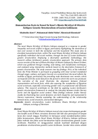 Alawi, Sihabudin and Halim, Muhammad Abdul and Khomisah, Khomisah (2025) Humanitarian facts in Nawal Sa'dawi’s mautu ma’aliyyi al-waziru sabiqan: Genetic structuralism of lucien goldmann. Tsaqofiya : Jurnal Pendidikan Bahasa dan Sastra Arab, 7 (2). pp. 606-629. ISSN 2685-7022