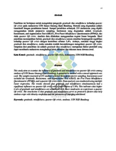 Penelitian ini bertujuan untuk mengetahui pengaruh gratitude dan mindfulness terhadap quarter life crisis pada mahasiswa UIN Sunan Gunung Djati Bandung. Metode yang digunakan adalah kuantitatif dengan pendekatan kausal. Sampel penelitian sebanyak 255 mahasiswa yang dipilih menggunakan teknik purposive sampling. Instrumen yang digunakan adalah Gratitude, Resentment, and Appreciation Test (GRAT), Five Facet Mindfulness Questionnaire (FFMQ), dan skala quarter life crisis. Analisis data dilakukan menggunakan regresi linear berganda. Hasil penelitian menunjukkan bahwa gratitude dan mindfulness secara simultan berpengaruh signifikan terhadap quarter life crisis dengan kontribusi sebesar 5,6%. Artinya, semakin tinggi tingkat gratitude dan mindfulness, maka semakin rendah kecenderungan mengalami quarter life crisis. Simpulan dari penelitian ini adalah gratitude dan mindfulness merupakan faktor protektif yang dapat membantu mahasiswa menghadapi krisis identitas dan tekanan masa dewasa awal.