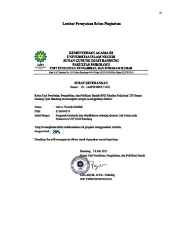Uncontrolled Keywords: | gratitude; mindfulness; quarter life crisis; mahasiswa; UIN SGD Bandung |
