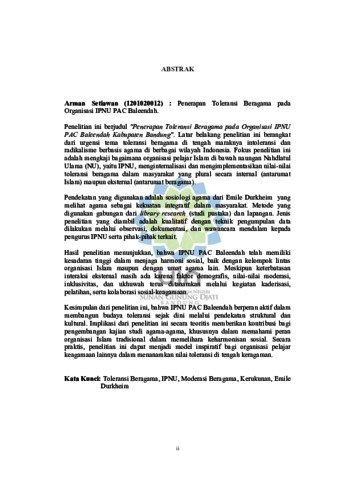 Penelitian ini berjudul "Penerapan Toleransi Beragama pada Organisasi IPNU PAC Baleendah Kabupaten Bandung". Latar belakang penelitian ini berangkat dari urgensi tema toleransi beragama di tengah maraknya intoleransi dan radikalisme berbasis agama di berbagai wilayah Indonesia. Fokus penelitian ini adalah mengkaji bagaimana organisasi pelajar Islam di bawah naungan Nahdlatul Ulama (NU), yaitu IPNU, menginternalisasi dan mengimplementasikan nilai-nilai toleransi beragama dalam masyarakat yang plural secara internal (antarumat Islam) maupun eksternal (antarumat beragama). Pendekatan yang digunakan adalah sosiologi agama dari Emile Durkheim yang melihat agama sebagai kekuatan integratif dalam masyarakat. Metode yang digunakan gabungan dari library research (studi pustaka) dan lapangan. Jenis penelitian yang diambil adalah kualitatif dengan teknik pengumpulan data dilakukan melalui observasi, dokumentasi, dan wawancara mendalam kepada pengurus IPNU serta pihak-pihak terkait. Hasil penelitian menunjukkan, bahwa IPNU PAC Baleendah telah memiliki kesadaran tinggi dalam menjaga harmoni sosial, baik dengan kelompok lintas organisasi Islam maupun dengan umat agama lain. Meskipun keterbatasan interaksi eksternal masih ada karena faktor demografis, nilai-nilai moderasi, inklusivitas, dan ukhuwah terus ditanamkan melalui kegiatan kaderisasi, pelatihan, serta kolaborasi sosial-keagamaan. Kesimpulan dari penelitian ini, bahwa IPNU PAC Baleendah berperan aktif dalam membangun budaya toleransi sejak dini melalui pendekatan struktural dan kultural. Implikasi dari penelitian ini secara teoritis memberikan kontribusi bagi pengembangan kajian studi agama-agama, khususnya dalam memahami peran organisasi Islam tradisional dalam memelihara keharmonisan sosial. Secara praktis, penelitian ini dapat menjadi model inspiratif bagi organisasi pelajar keagamaan lainnya dalam menanamkan nilai toleransi di tengah keragaman.