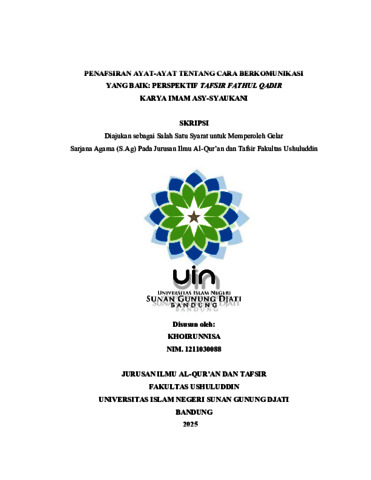 Khoirunnisa, Khoirunnisa (2025) Penafsiran ayat-ayat tentang cara berkomunikasi yang baik: Perspektif tafsir Fathul Qadir karya Imam Asy-Syaukani. Sarjana thesis, UIN Sunan Gunung Djati Bandung.