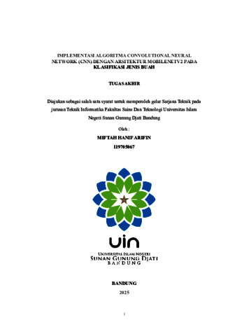 arifin, miftah hanif (2025) Implementasi Algoritma convolutional Neural Network(CNN) dengan Arsitektur MobileNetV2 pada Klasifikasi Jenis Buah. Sarjana thesis, UIN Sunan Gunung Djati Bandung.