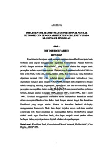 Penelitian ini bertujuan untuk mengembangkan sistem klasifikasi jenis buah berbasis citra digital menggunakan algoritma Convolutional Neural Network (CNN) dengan arsitektur MobileNetV2, yang dikenal efisien dan ringan untuk perangkat terbatas seperti smartphone. Dataset yang digunakan terdiri dari 500 citra lima jenis buah, yaitu apel, pisang, nanas, jeruk, dan buah naga, yang kemudian diperluas menjadi 2.441 citra melalui proses augmentasi. Metodologi yang digunakan mengacu pada tahapan CRISP-DM, meliputi data preparation dengan teknik cropping, resizing, augmentasi, normalisasi, dan one-hot encoding. Hasil pengujian menunjukkan bahwa model MobileNetV2 mampu memberikan performa terbaik, dengan akurasi mencapai 100%, presisi 100%, recall 100%, dan f1-score 100%. Evaluasi menggunakan confusion matrix memperkuat keandalan model dalam mengklasifikasikan lima kelas buah dengan akurasi tinggi dan kesalahan klasifikasi yang sangat minim. Sistem ini kemudian berhasil di-deploy menggunakan framework Flask dan dapat berjalan secara real-time melalui antarmuka web. Hasil penelitian ini menunjukkan bahwa MobileNetV2 sangat efektif untuk tugas klasifikasi buah, dan dapat menjadi solusi praktis dalam berbagai bidang seperti pertanian digital, edukasi, dan perdagangan. Kata kunci: Klasifikasi Buah, Convolutional Neural Network, MobileNetV2, Citra Digital, CRISP-DM.