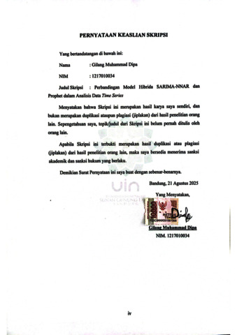 Dipa, Gilang Muhammad (2025) Perbandingan model Hibrida SARIMA-NNAR dan Prophet dalam analisis data time series. Sarjana thesis, UIN Sunan Gunung Djati Bandung.
