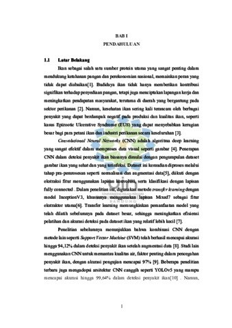 INDONESIA : Penyakit pada ikan merupakan salah satu penyebab utama menurunnya produktivitas dalam budidaya perikanan. Deteksi dini terhadap penyakit ikan sangat penting untuk mencegah penyebaran dan mengurangi kerugian ekonomi. Penelitian ini bertujuan untuk mengembangkan sistem deteksi penyakit ikan berbasis citra digital menggunakan algoritma Convolutional Neural Network (CNN) dengan pendekatan transfer learning pada arsitektur InceptionV3, menggunakan lapisan Mixed7 sebagai ekstraktor fitur utama. Dataset yang digunakan terdiri dari gambar ikan sehat dan gambar ikan yang terinfeksi enam jenis penyakit: White Tail Disease, Saprolegniasis, Aeromoniasis, Bacterial Gill Disease, Bacterial Red Disease, dan Parasitic Disease. Gambar dikumpulkan dari sumber terbuka dan diproses melalui tahapan pra-pemrosesan serta pembagian data untuk pelatihan dan pengujian. Model dikembangkan dengan memanfaatkan arsitektur InceptionV3 tanpa lapisan klasifikasi akhir dan dilengkapi dengan lapisan klasifikasi kustom. Hasil pelatihan menunjukkan bahwa model berhasil mencapai akurasi validasi hingga 96%, dan mampu mengklasifikasikan penyakit ikan dengan baik pada data asli dengan tingkat akurasi yang tinggi. Sistem ini memiliki potensi untuk diterapkan dalam deteksi dini penyakit ikan secara otomatis dan efisien di lingkungan nyata. ENGLISH : Fish diseases are one of the major factors contributing to reduced productivity in aquaculture. Early detection of fish diseases is essential to prevent outbreaks and minimize economic losses. This study aims to develop a fish disease detection system based on digital images using the Convolutional Neural Network (CNN) algorithm with a transfer learning approach, employing the InceptionV3 architecture and utilizing the Mixed7 layer as the main feature extractor. The dataset comprises images of healthy fish and fish infected with six types of diseases: White Tail Disease, Saprolegniasis, Aeromoniasis, Bacterial Gill Disease, Bacterial Red Disease, and Parasitic Disease. The images were sourced from open platforms and processed through preprocessing and data splitting for training and testing. The model was built by utilizing InceptionV3 without its top classification layers and enhanced with a custom classification head. The training results indicate that the model achieved up to 96% validation accuracy and was able to accurately classify fish diseases in real-world image data. This system shows strong potential for practical and efficient early disease detection in aquaculture environments.