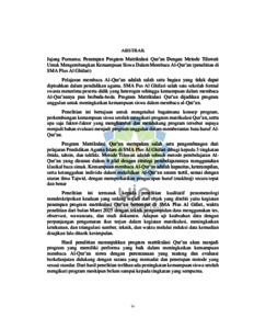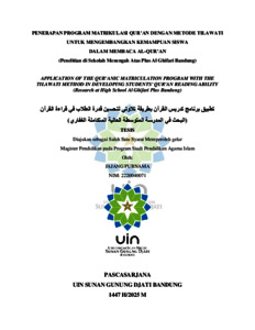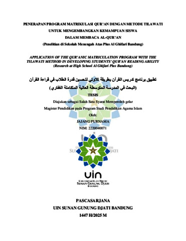 Purnama, Jajang (2025) Penerapan program matrikulasi Qur'an dengan metode tilawati untuk mengembangkan kemampuan siswa dalam membaca al-Qur'an : Penelitian di sekolah menengah atas plus al Ghifari Bandung. Masters thesis, UIN Sunan Gunung Djati Bandung.