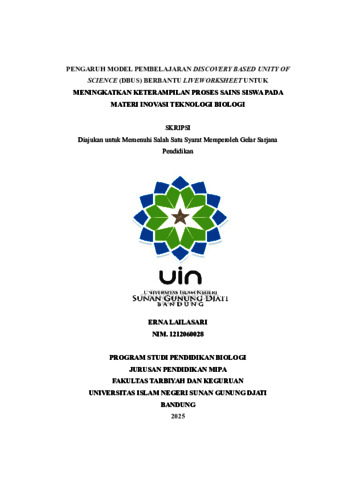 Lailasari, Erna (2025) Pengaruh model pembelajaran Discovery Based Unity of Science (DBUS) berbantu Liveworksheet untuk meningkatkan keterampilan proses Sains Siswa pada materi Inovasi Teknologi Biologi. Sarjana thesis, UIN Sunan Gunung Djati Bandung.