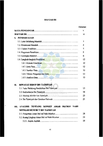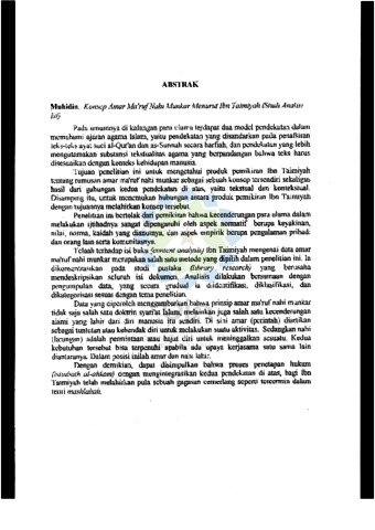 Muhidin. Konsep Amar Ma'ruf Nahi Munkar Menurut Ibn Taimiyah (Studi Analisi Isi) Pada umumnya di kalangan para ulama terdapat dua model pendekatan dalam memahami ajaran agama Islam, yaitu pendekatan yang disandarkan pada penafsiran teks-teks ayat suci Al-Qur'an dan as-Sunnah secara harfiah, dan pendekatan yang lebih mengutamakan substansi teks-teks agama yang berpandangan bahwa teks harus disesuaikan dengan konteks kehidupan manusia. Tujuan penelitian ini untuk mengetahui produk pemikiran Ibn Taimiyah tentang rumusan amar ma'ruf nahi munkar sebagai sebuah konsep tersendiri sekaligus hasil dari gabungan kedua pendekatan di atas, yaitu tekstual dan kontekstual. Disamping itu, untuk menemukan hubungan antara produk pemikiran Ibn Taimiyah dengan tujuannya melahirkan konsep tersebut. Penelitian ini bertolak dari pemikiran bahwa kecenderungan para ulama dalam melakukan ijtihadnya sangat dipengaruhi oleh aspek normatif berupa keyakinan, nilai, norma, kaidah yang dianutnya, dan aspek empirik berupa pengalaman pribadi dan orang lain serta komunitasnya. Telaah terhadap isi buku (content analysis) Ibn Taimiyah mengenai data amar ma'ruf nahi munkar merupakan salah satu metode yang dipilih dalam penelitian ini. Ia dikonsentrasikan pada studi pustaka (library research) yang berusaha mendeskripsikan seluruh isi dokumen. Analisis dilakukan bersamaan dengan pengumpulan data yang secara gradual ia diidentifikasi, diklasifikasi, dan dikategorisasi sesuai dengan tema penelitian. Data yang diperoleh menggambarkan bahwa prinsip amar ma'ruf nahi munkar tidak saja salah satu doktrin syari'at Islam, melainkan juga salah satu kecenderungan alam yang lahir dari diri manusia itu sendiri. Di sini amar (perintah) diartikan sebagai tuntutan atau kehendak diri untuk melakukan suatu aktivitas. Sedangkan nahi (larangan) adalah permintaan atau hajat diri untuk meninggalkan sesuatu. Kedua kebutuhan tersebut bisa terpenuhi apabila ada upaya kerjasama satu sama lain diantaranya. Dalam posisi inilah amar dan nahi lahir. Dengan demikian, dapat disimpulkan bahwa proses penetapan hukum (istinbath al-ahkam) dengan mengintegrasikan kedua pendekatan di atas, bagi Ibn Taimiyah telah melahirkan pula sebuah gagasan cemerlang seperti tercermin dalam teori maslahah.