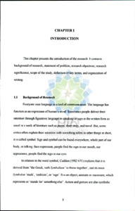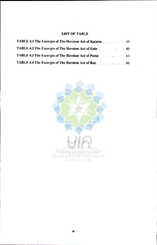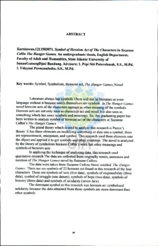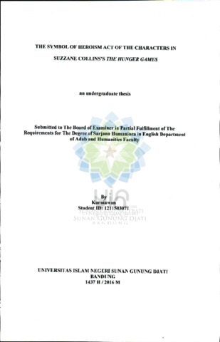 Kurniawan.1211503071.* Symbol of Heroism Act of The Characters in Suzanne Collin The Hunger Games*. An undergraduate thesis, English Department, Faculty of Adab and Humanities, State Islamic University of SunanGunungDjati Bandung. Advisors: 1. Pepi Siti Paturrohmah, S.S., M.Pd. 2. Udayani Permanaludin, S.S., M.Pd. Key words: Symbol, Symbolism, Heroism act, The Hunger Games, Novel Literature always has symbols. There will not be literature or even language without it because words themselves are symbols. In The Hunger Games novel heroism acts of the characters appears as other meanings of the symbols. Heroism acts are not only seen as characters' acts and mind, but also seen as something which has more symbols and meanings. So, this graduating paper has been written to analyze symbol of heroism act of the characters in Suzanne Collin's The Hunger Games. The grand theory which is used to analyze this research is Pierce's theory. It has three elements on modifying something or data into a symbol: there are representation, interpretant, and symbol. This research used three elements into the object and applied it to get symbols and other meanings. The novel is analyzed by the theory of symbolism because Collin's work has other meanings and symbols of heroism acts. In applying the technique of analyzing data, this research used qualitative research. The data are collected from originally words, sentences and narration of The Hunger Games novel by Suzzane Collins. The data was taken from Suzanne Collins novel entitled The Hunger Games. There are six symbols of the heroism act found in this research of the four characters. Those are symbols of love (five data), symbols of responsibility (three data), symbol of struggle (one datum), symbols of hope (two data), symbols of bravery (three data) and symbols of solidarity (seven data). The dominant symbol in this research was heroism act symbolized solidarity because the data obtained from those symbols are more dominant than other symbols. **Kurniawan.1211503071.**Symbol of Heroism Act of The Characters in Suzanne Collin The Hunger Games. An undergraduate thesis, English Department, Faculty of Adab and Humanities, State Islamic University of SunanGunungDjati Bandung. Advisors: 1. Pepi Siti Paturrohmah, S.S., M.Pd. 2. Udayani Permanaludin, S.S., M.Pd. Key terms: Simbol, Simbolism, Tindak kepahlawanan, The Hunger Games, Novel Karya sastra selalu memiliki sebuah simbol, tanpa simbol tidak akan ada karya sastra atau bahkan bahasa, karena kata-kata sendiri adalah simbol. Dalam novel The Hunger Games, tindakan kepahlawanan dari karakter muncul sebagai arti dan simbol lain. Tindakan kepahlawanan dari karakter tidak hanya dilihat sebagai tindakan karaker dan pikiranya, tetapi juga dilihat sebagai sesuatu simbol-simbol dan arti. Jadi, dalam skripsi ini peneliti memutuskan untuk menganalisis bagaimana simbol tindak kepahlawanan dari karakter terjelaskan dalam novel The Hunger Games. Teori utama yang peneliti gunakan untuk menganalisis penelitian ini adalah teori simbol Pierce. Teori tersebut memiliki tiga elemen dalam mengubah sesuatu atau data menjadi simbol, ketiga elemen tersebut yaitu representment, interpretant dan simbol. Peneliti menggunakan tiga element tersebut terhadap objek dan menerapkannya kepada simbol-simbol yang telah ditemukan. Karya sastra Collins dianalisis menggunakan teori simbolisme karena karya Collin yang berisi simbol tindak kepahlawanan. Dalam penerapan tehnik analisis data, penelitian ini menggunakan metode kualitatif. Data diambil dari kata-kata asli, kalimat-kalimat dan narasi dari novel The Hunger Games karya Suzanne Collins. Data diambil dari novel Suzanne Collins yang berjudul The Hunger Games. Terdapat 22 tindak kepahlawanan dari empat karakter dalam penelitian ini. Tindakan kepahlawanan tersebut yaitu simbol kasih sayang (lima data), simbol tanggung jawab (tiga data), simbol perjuangan (satu data), simbol harapan (dua data), simbol keberanian (tiga data) dan simbol solidaritas (tujuh data). Simbol yang dominan dalam penelitian ini adalah tindak kepahlawanan yang melambangkan solidaritas karena data yang diperoleh dari symbol tersebut lebih banyak dari pada simbol-simbol yang lainnya.