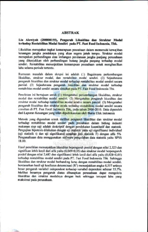 Lia Alawiyah (208800155), Pengaruh Likuiditas dan Struktur Modal terhadap Rentabilitas Modal Sendiri pada PT. Fast Food Indonesia, Tbk. Likuiditas merupakan tingkat kemampuan perusahaan dalam memenuhi kewajiban keuangan jangka pendeknya yang akan segera jatuh tempo. Struktur modal merupakan perbandingan atau imbangan pendanaan jangka panjang perusahaan yang ditunjukkan oleh perbandingan hutang jangka panjang terhadap modal sendiri. Rentabilitas menunjukkan kemampuan perusahaan untuk menghasilkan laba selama periode tertentu. Rumusan masalah dalam skripsi ini adalah (1) Bagaimana perkembangan likuiditas, struktur modal, dan rentabilitas modal sendiri. (2) Sejauh mana pengaruh likuiditas dan struktur modal terhadap rentabilitas modal sendiri secara parsial. (3) Sejauhmana pengaruh likuiditas dan struktur modal terhadap rentabilitas modal sendiri secara simultan pada PT. Fast Food Indonesia Tbk. Penelitian ini bertujuan untuk (1) Mengetahui perkembangan likuiditas, struktur modal dan rentabilitas modal sendiri. (2) Mengetahui pengaruh likuiditas dan struktur modal terhadap rentabilitas modal sendiri secara parsial. (3) Mengetahui pengaruh likuiditas dan struktur modal terhadap rentabilitas modal sendiri secara simultan di PT. Fast Food Indonesia Tbk, pada tahun 2000-2010. Data diperoleh dari Laporan Keuangan yang telah dipublikasikan oleh Bursa Efek Indonesia. Metode yang digunakan untuk melihat pengaruh likuiditas dan struktur modal terhadap rentabilitas modal sendiri pada perusahaan dalam industri makanan siap saji adalah deskriptif dengan pendekatan kuantitatif dan statistik. Pengujian hipotesis dilakukan dengan uji statistik yaitu uji signifikansi individual (uji statistik t) dan uji signifikansi simultan (uji statistik F) dengan alfa 5%. Penganalisisan data menggunakan software pengelolaan data statistik yaitu SPSS 18.00. Hasil penelitian menunjukkan likuiditas berpengaruh positif dengan nilai 2,323 dan signifikan lebih kecil dari nilai alfa (0,049<0,05) dan struktur modal berpengaruh positif dengan nilai 2,682 dan signifikansi lebih kecil dari nilai alfa (0,028<0,05) terhadap rentabilitas modal sendiri. Adapun hasil F-test menunjukkan bahwa likuiditas dan struktur modal secara simultan berpengaruh signifikan terhadap rentabilitas modal sendiri dengan nilai signifikansi 0,003 lebih kecil dari alfa (0,05). Hal ini berarti hipotesis yang diajukan dalam penelitian ini terbukti atau dapat diterima. Kesimpulan dari penelitian ini adalah likuiditas dan struktur modal secara parsial maupun simultan berpengaruh signifikan terhadap rentabilitas modal sendiri. Melihat hasil penelitian ini, maka disarankan agar perusahaan tetap mempertahankan likuiditas dan struktur modalnya dengan baik sehingga dapat tercapai laba yang maksimal pada perusahaan.