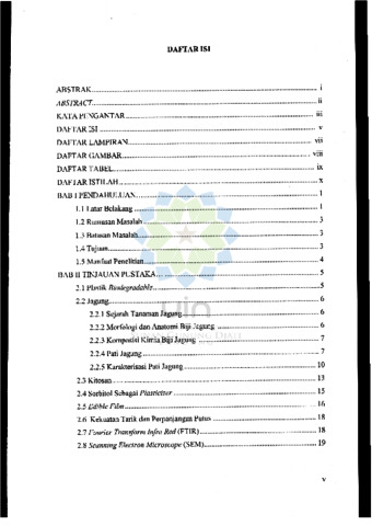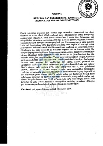 PREPARASI DAN KARAKTERISASI EDIBLE FILM DARI POLIBLEND PATI JAGUNG-KITOSAN Plastik pengemas makanan dari sumber daya terbarukan (renewable) dan dapat dihancurkan secara alami (biodegradable) perlu dikembangkan untuk mengurangi permasalahan lingkungan. Salah satunya dalam bentuk edible film. Penggunaan pati sebagai bahan baku utama pembuatan edible film memiliki potensi yang besar, karena di Indonesia terdapat berbagai tanaman penghasil pati di antaranya jagung yang memiliki kadar pati hingga sebesar 75% dan umur panen yang lebih singkat. Akan tetapi, edible film berbahan pati masih memiliki sifat mekanik dan ketahanan air yang masih rendah. Oleh karena itu, pada penelitian ini dilakukan preparasi dan karakterisasi edible film dari pati jagung blending kitosan dengan penambahan sorbitol. Penambahan biopolimer kitosan diharapkan dapat memperbaiki sifat ketahanan air (hidrofobitas) dan sifat mekanik edible film yang dihasilkan. Tujuan penambahan sorbitol sebagai plasticizer untuk meningkatkan elastisitas edible film. Metode penelitian ini meliputi dua tahapan. Pertama, yaitu preparasi dan karakterisasi pati jagung. Kedua, preparasi dan karakterisasi edible film. Hasil karakterisasi pati yaitu diperoleh kadar pati sebesar 79,6% dengan kadar amilosa 21%, kadar amilopektin 78,6%, suhu gelatinisasi 78,99$^\circ$C, kadar air 12,77%, serta derajat kecerahan yang menunjukkan karakteristik cerah dan berwarna abu-abu pucat. Hasil terbaik pada ketahanan air yang dapat dilihat dari nilai water uptake sebesar 140,91% pada formulasi pati dan kitosan 6:4 g/g. Hasil terbaik pada penelitian ini diperoleh kuat tarik dan modulus young pada formulasi pati kitosan 6:4 yaitu berturut-turut 4,52 MPa dan 7,01 MPa, nilai elongasi terbaik pada formulasi 8:2 yaitu 18,80%. Hasil SEM menunjukkan morfologi permukaan edible film pati-kitosan dengan formulasi 6:4 terdapat retakan dan masih berpori. Kata kunci: pati jagung, kitosan, sorbitol, edible film, SEM.