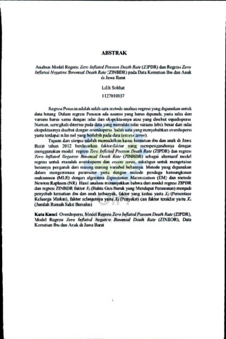 Analisis Model Regresi Zero Inflated Poisson Death Rate (ZIPDR) dan Regresi Zero Inflated Negative Binomial Death Rate (ZINBDR) pada Data Kematian Ibu dan Anak di Jawa Barat Lilih Solihat 1127010037 Regresi Poisson adalah salah satu metode analisis regresi yang digunakan untuk data hitung. Dalam regresi Poisson ada asumsi yang harus dipenuhi yaitu nilai dari varians harus sama dengan nilai dari ekspektasinya atau yang disebut equidispersion. Namun, seringkali ditemu pada data yang memiliki nilai varians lebih besar dari nilai ekspektasinya disebut dengan overdispersion. Salah satu yang menyebabkan overdispersion yaitu terdapat nilai nol yang berlebih pada data (excess zeros). Tujuan dari skripsi adalah memodelkan kasus kematian ibu dan anak di Jawa Barat tahun 2012 berdasarkan faktor-faktor yang mempengaruhinya dengan menggunakan model regresi Zero Inflated Poisson Death Rate (ZIPDR) dan regresi Zero Inflated Negative Binomial Death Rate (ZINBDR) sebagai alternatif model regresi untuk masalah overdispersion dan excess zeros, sekaligus untuk mengetahui besarnya pengaruh dari masing-masing variabel bebasnya. Metode yang digunakan dalam mengestimasi parameter yaitu dengan metode penduga kemungkinan maksimum (MLE) dengan algoritma Expectation Maximization (EM) dan metode Newton Raphson (NR). Hasil analisis menunjukkan bahwa dari model regresi ZIPDR dan regresi ZINBDR faktor X 1 (Balita Gizi Buruk yang Mendapat Perawatan) menjadi penyebab kematian ibu dan anak terbanyak, faktor yang kedua yaitu X 2 (Persentase Keluarga Miskin), faktor selanjutnya yaitu X 3 (Penyakit) dan faktor terakhir yaitu X 4 (Jumlah Rumah Sakit Bersalin). Kata Kunci: Overdispersion, Model Regresi Zero Inflated Poisson Death Rate (ZIPDR), Model Regresi Zero Inflated Negative Binomial Death Rate (ZINBDR), Data Kematian Ibu dan Anak di Jawa Barat