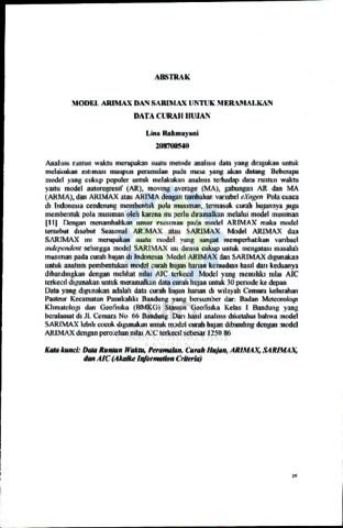 ANALISIS RUN TUN WAKTU MERUPAKAN SUATU METODE ANALISIS DATA YANG DITUJUKAN UNTUK MELAKUKAN ESTIMASI MAUPUN PERAMALAN PADA MASA YANG AKAN DATANG. BEBERAPA MODEL YANG CUKUP POPULER UNTUK MELAKUKAN ANALISIS TERHADAP DATA RUN TUN WAKTU YAITU MODEL AUTOREGRESIF (AR), MOVING AVERAGE (MA), GABUNGAN AR DAN MA (ARMA), DAN ARIMAX ATAU ARIMA DENGAN TAMBAHAN VARIABEL EKOGEN. POLA CUACA DI INDONESIA CENDERUNG MEMBENTUK POLA MUSIMAN, TERMASUK CURAH HUJANNYA JUGA MEMBENTUK POLA MUSIMAN OLEH KARENA ITU PERLU DIRAMALKAN MELALUI MODEL MUSIMAN [11]. DENGAN MENAMBAHKAN UNSUR MUSIMAN PADA MODEL ARIMAX MAKA MODEL TERSEBUT DISEBUT SEASONAL ARIMAX ATAU SARIMAX. MODEL ARIMAX DAN SARIMAX INI MERUPAKAN SUATU MODEL YANG SANGAT MEMPERHATIKAN SARIBAGI INDEPENDENT SEHINGGA MODEL SARIMAX INI DIRASA CUKUP UNTUK MENGATASI MASALAH MUSIMAN PADA CURAH HUJAN DI INDONESIA. MODEL ARIMAX DAN SARIMAX DIGUNAKAN UNTUK ANALISIS PEMBENTUKAN MODEL CURAH HUJAN HARIAN KEMUDIAN HASIL DARI KEDUANYA DIBANDINGKAN DENGAN MELIHAT NILAI AIC TERKECIL. MODEL YANG MEMILIKI NILAI AIC TERKECIL DIGUNAKAN UNTUK MERAMALKAN DATA CURAH HUJAN UNTUK 30 PERIODE KE DEPAN. DATA YANG DIGUNAKAN ADALAH DATA CURAH HUJAN HARIAN DI WILAYAH CEMARA KELURAHAN PASIRHEUR KECAMATAN PADAUKAKIKI BANDUNG YANG BERSUMBER DARI BADAN METEOROLOGI KLIMATOLOGI DAN GEOFISIKA (BMKG) STASIUN GEOFISIKA KELAS 1 BANDUNG YANG BERALAMAT DI JL. CEMARA NO 66 BANDUNG. DARI HASIL ANALISIS DIKETAHUI BAHWA MODEL SARIMAX LEBIH COCOK DIGUNAKAN UNTUK MODEL CURAH HUJAN DIBANDING DENGAN MODEL ARIMAX DENGAN PEROLEHAN NILAI AIC TERKECIL SEBESAR 1250 86. KATA KUNCI: DATA RUN TUN WAKTU, PERAMALAN, CURAH HUJAN, ARIMAX, SARIMAX, DAN AIC (AKAIKE INFORMATION CRITERIA) Sumber MODEL ARIMAX AND SARIMAX FOR FORECASTING DATA RAINFALL Lina Rahmayani 208700540 Time series analysis is a method of data analysis aimed at estimating and forecasting the future. Some models are popular enough to conduct an analysis of time series data is a model autoregressive (AR), moving average (MA), the combined AR and MA (ARMA), and ARIMAX or ARIMA with additional exogenous variables. Weather patterns in Indonesia tend to establish seasonal patterns, including rainfall also established seasonal patterns. It is therefore necessary seasonal predicted by the model [11]. By adding seasonal elements to the model ARIMAX then the model is called Seasonal ARIMAX or SARIMAX. ARIMAX and SARIMAX Model is a model that is very common, saribag ARIMAX independent so that the model is considered sufficient to overcome the problem of seasonal rainfall in Indonesia. Model ARIMAX and SARIMAX used for the analysis of daily rainfall modeling and then compared with the results of both see the value of the smallest AIC. The model has the smallest AIC value is used to predict the rainfall data for 30 periods ahead. The data used are daily precipitation data in urban areas Badaa Meteorology Klimatologi and Geofisika (BMKG) Stasiun Geofisika Kelas 1 Bandung is located at Jl Cemara No 66 Bandung. From the analysis it is known that the model SARIMAX more suitable to model precipitation compared with ARIMAX models with the smallest AIC value of the acquisition amounted to 1250 86. Keywords: Data Time Series, Forecasting, Rainfall, ARIMAX, SARIMAX, and AIC (Akaike Information Criteria)