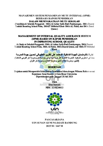 Irawati, Dini (2025) Manajemen Sistem Penjaminan Mutu Internal (SPMI) berbasis rapor pendidikan dalam meningkatkan mutu sekolah: Penelitian di Sekolah Penggerak: SMA Al Azhar Syifa Budi Parahyangan, SMA Daarut Tauhiid Boarding School Putra, SMA Al Falah, SMA Daarul Quran dan SMA IT Miftahul Khoir. Doktoral thesis, UIN Sunan Gunung Djati Bandung.