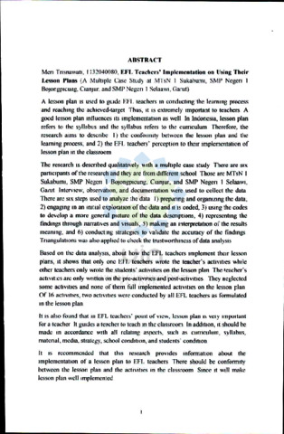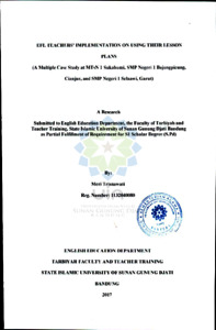 Mori Trisnawati, 1132040080. EFL Teachers' Implementation on Using Their Lesson Plans (A Multiple Case Study at MTsN 1 Sukabumi, SMP Negeri 1 Bojongpicung, Cianjur, and SMP Negeri 1 Selaawi, Garut) A lesson plan is used to guide EFL teachers in conducting the learning process and reaching the achieved-target. Thus, it is extremely important to teachers. A good lesson plan influences its implementation as well. In Indonesia, lesson plan refers to the syllabus and the syllabus refers to the curriculum. Therefore, the research aims to describe 1) the conformity between the lesson plan and the learning process, and 2) the EFL teachers' perception to their implementation of lesson plan in the classroom. The research is described qualitatively with a multiple case study. There are six participants of the research and they are from different school. Those are MTsN 1 Sukabumi, SMP Negeri 1 Bojongpicung, Cianjur, and SMP Negeri 1 Selaawi, Garut. Interview, observation, and documentation were used to collect the data. There are six steps used to analyze the data: 1) preparing and organizing the data, 2) engaging in an initial exploration of the data and it is coded, 3) using the codes to develop a more general picture of the data descriptions, 4) representing the findings through narratives and visuals, 5) making an interpretation of the results meaning, and 6) conducting strategies to validate the accuracy of the findings. Triangulations was also applied to check the trustworthiness of data analysis. Based on the data analysis, about how the EFL teachers implement their lesson plans, it shows that only one EFL teachers wrote the teacher's activities while other teachers only wrote the students' activities on the lesson plan. The teacher's activities are only written on the pre-activities and post-activities. They neglected some activities and none of them full implemented on the lesson plan. Of 16 activities, two activities were conducted by all EFL teachers as formulated in the lesson plans. It is also found that in EFL teachers' point of view, lesson plan is very important for a teacher. It guides a teacher to teach in the classroom. In addition, it should be made in accordance with all relating aspects, such as curriculum, syllabus, material, media, strategy, school condition, and students' condition. It is recommended that this research provides information about the implementation of a lesson plan to EFL teachers. There should be conformity between the lesson plan and the activities in the classroom. Since it will make lesson plan well implemented. Sumber
