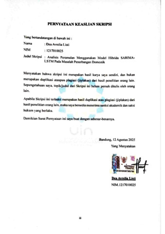Listi, Dea Avrelia (2025) Analisis peramalan menggunakan model hibrida Seasonal Autoregressive Integrated Moving Average (SARIMA)–Long Short-Term Memory (LSTM) pada masalah penerbangan domestik. Sarjana thesis, UIN Sunan Gunung Djati Bandung.