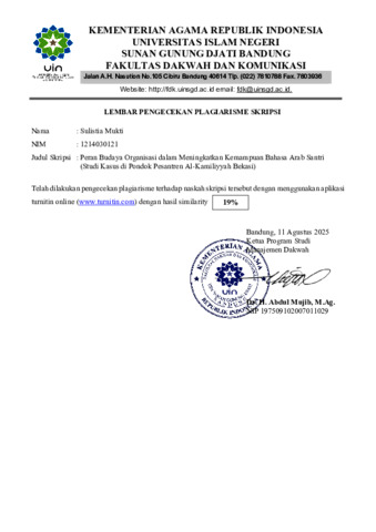 Mukti, Sulistia (2025) Peranan budaya organisasi dalam meningkatkan kepribadian santri: Studi deskriptif di Pondok Pesantren Al-Kamiliyyah Bekasi. Sarjana thesis, UIN Sunan Gunung Djati Bandung.