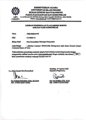 Rahmawati, Riska (2025) Aktivitas Customer Relationship Management Kafe Kumu Ground sebagai Communal Space di Tebet. Sarjana thesis, UIN Sunana Gunung Djati Bandung.