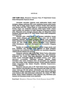 Antusiasme masyarakat Indonesia untuk melaksanakan ibadah umrah meningkat sehingga mendorong PPIU untuk memberikan layanan terbaik kepada Jemaah. Hal ini sejalan dengan tingginya ekspektasi Jemaah terkait pelayanan yang diberikan oleh PPIU. Seiring dengan itu, setiap perusahaan layanan umrah bersaing dengan cara memberikan pelayanan terbaik kepada Jemaah. Adapun tujuan penelitian dari penelitian ini adalah Mengetahui Perencanaan pelayanan prima, Mengetahui proses penerapan pelayanan prima, dan Mengetahui evaluasimanajemen pelayanan prima di PT. Shaff Berkah Tazkiya dalam meningkatkan kepuasan jemaah. Pelayanan prima adalah konsep yang bertujuan memberikan layanan terbaik kepada pelanggan atau masyarakat. Fokus utama teori ini adalah memastikan kebutuhan dan harapan pelanggan terpenuhi secara memuaskan, bahkan melampaui ekspektasi mereka. Menurut Barata, pelayanan prima dilandasi konsep A6, yaitu Attitude (Sikap), Attention (Perhatian), Action (Tindakan), Ability (Kemampuan), Appearance (Penampilan), dan Accountability (Tanggung Jawab). Penelitian ini menggunakan pendekatan kualitatif dengan metode studi kasus. Paradigma yang digunakan dalam penelitian ini adalah paradigma fenomenologi yaitu pendekatan dalam memahami dan menyelidiki pengalaman subjektif individu terhadap suatu fenomena. Manajemen pelayanan prima di PT. Shaff Berkah Tazkiya dilaksanakan secara terstruktur dan konsisten melalui tiga tahap utama, yaitu perencanaan, pelaksanaan, dan evaluasi. Pada tahap perencanaan, perusahaan merancang standar layanan berdasarkan prinsip A6 (attitude, attention, action, ability, appearance, accountability. Pelaksanaan pelayanan dilakukan dengan menerapkan sikap ramah, kemampuan teknis, dan penampilan yang profesional yang sesuai dengan standar operasional prosedur. Evaluasi pelayanan dilakukandengan menggunakan lima dimensi (Tangibles, Reliability, Responsiveness, Assurance, Empathy). Manajemen pelayanan prima di PT. Shaff Berkah Tazkiya menunjukkan bahwa pelayanan yang berkualitas tidak hanya ditentukan oleh fasilitas atau teknis semata, tetapi juga oleh nilai spiritual, profesionalitas, dan sistem evaluasi yang berkelanjutan. Dengan menerapkan konsep A6 dan prinsip kepuasan pelanggan secara konsisten pada tahap perencanaan, pelaksanaan, dan evaluasi, PT. Shaff Berkah Tazkiya berhasil membentuk sistem pelayanan yang berorientasi pada kepuasan dan kenyamanan jemaah secara menyeluruh.