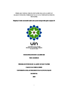 Muhammad Husen Alghifari, 1211030131, Skripsi ini berjudul “PERILAKU SOSIAL ORANG MUNAFIK DALAM AL-QUR’AN (KAJIAN TEMATIK TERHADAP AYAT-AYAT MENGENAI ORANG MUNAFIK)” Jurusan Ilmu Al-Qur’an dan Tafsir, Fakultas Ushuluddin, Universitas Islam Negeri Sunan Gunung Djati Bandung, 2025. Kemunafikan merupakan permasalahan sosial yang tidak hanya terjadi pada masa lalu, tetapi juga terus hadir dalam dinamika kehidupan masyarakat saat ini. Dalam era kontemporer, kemunafikan sering tampil dalam bentuk pencitraan dan perilaku yang tidak mencerminkan kejujuran identitas diri. Al-Qur’an secara tegas memotret karakteristik orang-orang munafik melalui berbagai ayat yang sarat dengan nilai moral dan sosial. Kajian ini berupaya menelusuri lebih dalam makna perilaku munafik tersebut melalui pendekatan tematik dan ditinjau menggunakan teori dramaturgi Erving Goffman. Penelitian ini bertujuan untuk menggambarkan bagaimana Al-Qur’an menguraikan perilaku orang munafik dan bagaimana nilai-nilai tersebut masih sangat relevan di tengah tantangan sosial modern. Teori dramaturgi Goffman digunakan sebagai lensa analisis untuk melihat kesamaan antara perilaku sosial kaum munafik dan cara individu memainkan peran sosial yang berbeda antara ruang publik dan ruang privat. Adapun Metode penelitian ini menggunakan pendekatan kualitatif dengan model tafsir maudhu'i (tematik) terhadap ayat-ayat Al-Qur’an yang berbicara mengenai kemunafikan. Hasil kajian menunjukkan bahwa perilaku kaum munafik dalam Al-Qur’an seperti berpura-pura dalam keimanan, menyampaikan ucapan manis namun menipu, serta menciptakan keresahan sosial sangat sejalan dengan konsep panggung sosial dalam teori Goffman. Penampilan yang dibuat-buat untuk mempertahankan citra diri menunjukkan bahwa kemunafikan adalah bagian dari dinamika sosial yang kompleks. Pesan moral Al-Qur’an tentang kejujuran, integritas, dan konsistensi antara ucapan dan perbuatan tetap menjadi pijakan penting untuk membangun masyarakat yang lebih autentik dan bermartabat.