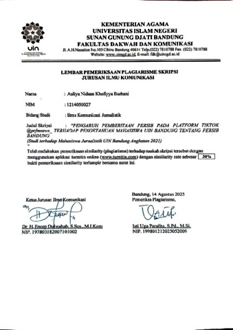 Burhani, Auliya Nidaan Khofiyya (2025) Pengaruh pemberitaan persib pada Platform Tiktok @prfmnews_ terhadap pengetahuan mahasiswa UIN Bandung tenang informasi persib Bandung : Studi terhadap mahasiswa jurnalistik UIN Bandung angkatan 2021. Sarjana thesis, UIN Sunan Gunung Djati Bandung.