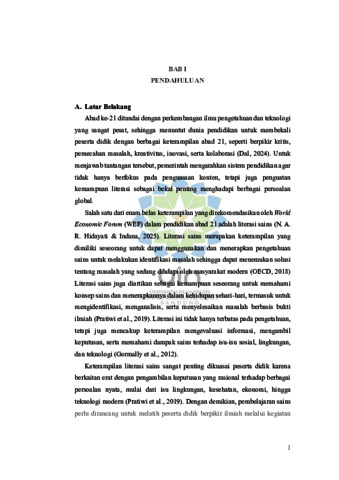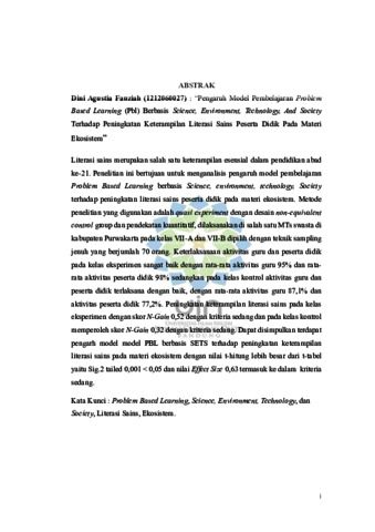 Fauziah, Dini Agustia (2025) Pengaruh model pembelajaran Problem Based Learning (PBL) berbasis Science, Environment, Technology and Society (SETS) terhadap peningkatan keterampilan literasi sains peserta didik pada materi ekosistem. Sarjana thesis, UIN Sunan Gunung Djati Bandung.