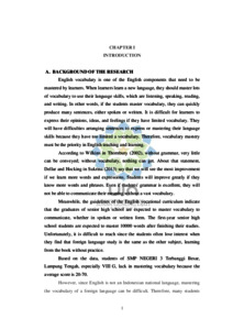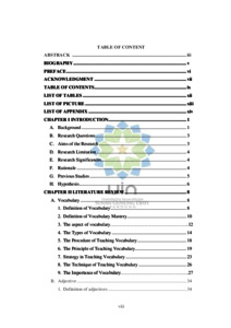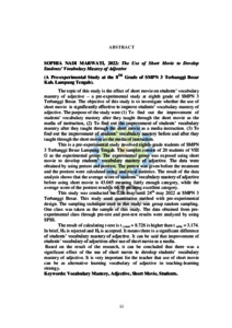 The topic of this study is the effect of short movie on students’ vocabulary mastery of adjective – a pre-experimental study at eighth grade of SMPN 3 Terbanggi Besar. The objective of this study is to investigate whether the use of short movie is significantly effective to improve students’ vocabulary mastery of adjective. The purpose of the study were (1) To find out the improvement of students' vocabulary mastery after they taught through the short movie as the media of instruction, (2) To find out the improvement of students’ vocabulary mastery after they taught through the short movie as a media instruction. (3) To find out the improvement of students’ vocabulary mastery before and after they taught through the short movie as the media of instruction. This is a pre-experimental study involved eighth-grade students of SMPN 3 Terbanggi Besar Lampung Tengah. The samples consist of 20 students of VIII G as the experimental group. The experimental group was exposed using short movie to develop students’ vocabulary mastery of adjective. The data were obtained by using pretest and posttest. The pretest was given before the treatment and the posttest were calculated using analytical statistics. The result of the data analysis shows that the average score of students’ vocabulary mastery of adjective before using short movie is 43.045 meaning fairly enough category, while the average score of the posttest result is 66.50 meaning excellent category. This study was conducted on 22th may until 24th may 2022 at SMPN 3 Terbanggi Besar. This study used quantitative method with pre-experimental design. The sampling technique used in this study was group random sampling. One class was taken as the sample of this study. The data obtained from pre- experimental class through pre-test and post-test results were analyzed by using SPSS. The result of calculating t-test is t count = 8.728 is higher than t table = 3.174. In brief, H0 is rejected and Ha is accepted. It means there is a significant difference of students’ vocabulary mastery of adjective. It can be said that improvement of students’ vocabulary of adjectives after use of short movie as a media. Based on the result of the research, it can be concluded that there was a significant effect of the use of short movie to develop students’ vocabulary mastery of adjective. It is very important for the teacher that use of short movie can be as alternative learning vocabulary of adjective in teaching-learning strategy.