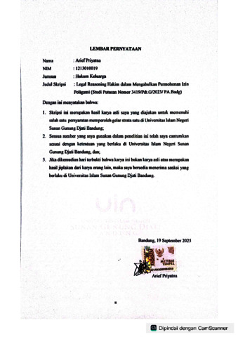 Priyatna, Arief (2025) Legal reasoning hakim dalam mengabulkan permohonan izin poligami : Studi putusan nomor 3419/Pdt.G/2023/PA.Badg. Sarjana thesis, UIN Sunan Gunung Djati Bandung.
