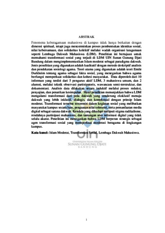 Fenomena keberagamaan mahasiswa di kampus tidak hanya berkaitan dengan dimensi spiritual, tetapi juga mencerminkan proses pembentukan identitas sosial, nilai kebersamaan, dan solidaritas kolektif melalui wadah organisasi keagamaan seperti Lembaga Dakwah Mahasiswa (LDM). Penelitian ini bertujuan untuk memahami transformasi sosial yang terjadi di LDM UIN Sunan Gunung Djati Bandung dalam mengimplementasikan Islam moderat sebagai paradigma dakwah. Jenis penelitian yang digunakan adalah kualitatif dengan metode deskriptif analisis dan pendekatan sosiologi agama. Teori utama yang digunakan adalah teori Emile Durkheim tentang agama sebagai fakta sosial, yang menegaskan bahwa agama berfungsi memperkuat solidaritas dan kohesi masyarakat. Data diperoleh dari 10 informan yang terdiri dari 5 pengurus aktif LDM, 3 mahasiswa umum, dan 2 alumni, melalui teknik observasi partisipatoris, wawancara semi-terstruktur, dan dokumentasi. Analisis data dilakukan secara induktif melalui proses reduksi, penyajian, dan penarikan kesimpulan. Hasil penelitian menunjukkan bahwa LDM mengalami transformasi dari pola dakwah yang cenderung eksklusif menuju dakwah yang lebih inklusif, dialogis, dan kontekstual dengan prinsip Islam moderat. Transformasi tersebut tercermin dalam kegiatan sosial yang melibatkan masyarakat kampus secara luas, penguatan nilai toleransi, serta pemanfaatan media digital sebagai sarana dakwah. Kendala yang dihadapi meliputi stigma radikalisme, rendahnya partisipasi mahasiswa, dan tantangan arus informasi digital yang tidak selalu akurat. Penelitian ini menegaskan bahwa LDM berperan strategis sebagai agen transformasi sosial yang memperkuat moderasi beragama di lingkungan kampus.