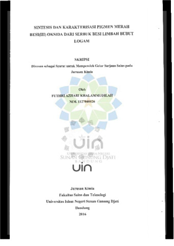 Khalammudilah, Futhri azhari (2016) Sintesis dan karakterisis pigmen merah besi (III) Oksida dari serbuk besi limbah bubut logam. Sarjana thesis, UIN Sunan Gunung Djati Bandung.