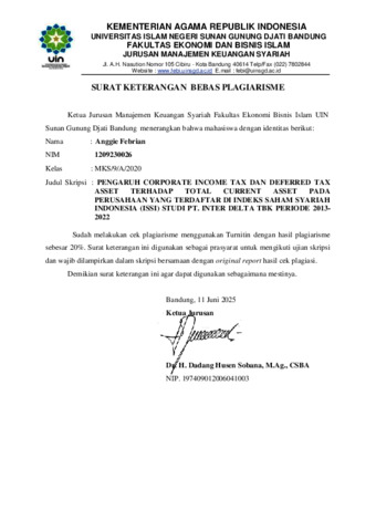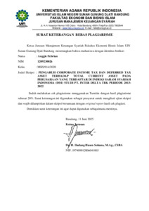 Febrian, Anggie (2025) Pengaruh corporate income tax dan deferred tax asset terhadap total current asset pada perusahaan yang terdaftar di Indeks Saham Syariah Indonesia (ISSI): Studi kasus di PT. Inter Delta Tbk. Periode 2013-2023. Sarjana thesis, UIN Sunan Gunung Djati Bandung.