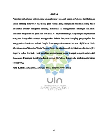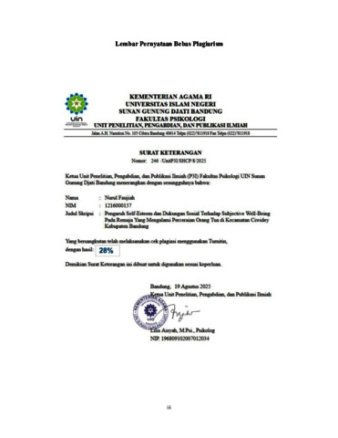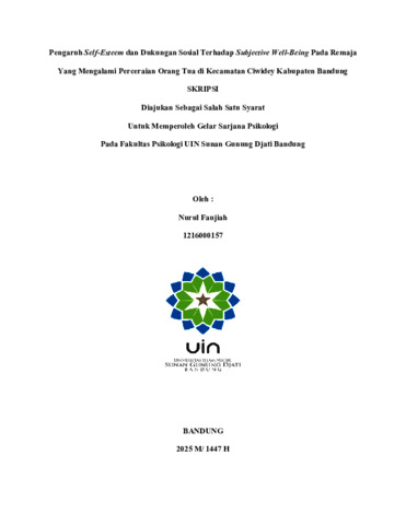 Faujiah, Nurul (2025) Pengaruh Self-Esteem dan dukungan sosial terhadap Subjective Well-Being pada remaja yang mengalami perceraian Orang Tua di Kecamatan Ciwidey Kabupaten Bandung. Sarjana thesis, UIN Sunan Gunung Djati Bandung.