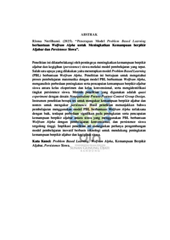 Nurilhami, Risma (2025) Penerapan model Problem Based Learning berbantuan Wolfram Alpha untuk meningkatkan kemampuan berpikir Aljabar dan persistence siswa. Sarjana thesis, UIN Sunan Gunung Djati Bandung.