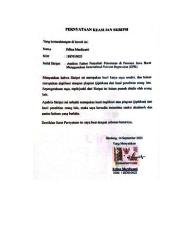 Mardiyanti, Erlina (2025) Analisis faktor penyebab perceraian di Provinsi Jawa Barat menggunakan Generalized Poisson Regression (GPR). Sarjana thesis, UIN Sunan Gunung Djati Bandung.
