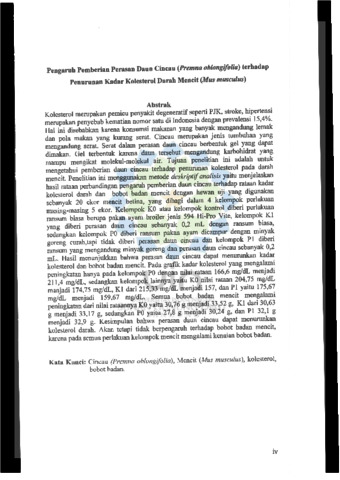 Pengaruh pemberian perasan daun cincau (Premna Oblongifia) terhadap penurunan kolesterol darah mencit (Mus Musculus)