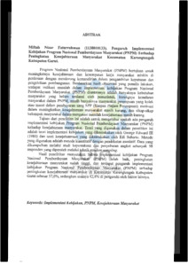 INDONESIA Program Nasional Pemberdayaan Masyarakat (PNPM) bertujuan untuk meningkatkan kesejahteraan dan kesempatan kerja masyarakat sejak di perdesaan dengan mendorong keindependenan dalam pengambilan keputusan dan pengelolaan pembangunan. Berdasarkan hasil observasi yang penulis lakukan, terdapat indikasi masalah dalam implementasi kebijakan program Nasional Pemberdayaan Masyarakat (PNPM) diantaranya adalah banyaknya kebutuhan masyarakat yang belum terpenuhi oleh pemerintah, kurangnya kesadaran masyarakat dalam PNPM, masih banyaknya masyarakat perempuan yang kolek atau mecat dalam pengambayaan uang SPP (Simpan Pinjam Perempuan), motivasi dalam meningkatkan kesejahteraan masyarakat masih kurang, dan sikap-sikap kelompok masyarakat dalam mengatasi masalah kesejahteraan masih kurang. Tujuan dari penelitian ini adalah untuk mengetahui apakah ada pengaruh implementasi kebijakan Program Nasional Pemberdayaan Masyarakat (PNPM) terhadap kesejahteraan masyarakat. Teori yang digunakan dalam penelitian ini adalah teori implementasi kebijakan yang dikemukakan oleh George Edward III (1980) dan teori kesejahteraan yang dikemukakan oleh Edi Suharto. Metode yang digunakan adalah metode kuantitatif dengan pendekatan asosiasi. Data yang dikumpulkan melalui studi kepustakaan dan the spread of the now as much as 98 respondents obtained through random sampling techniques. Hasil penelitian menyatakan bahwa implementasi kebijakan Program Nasional Pemberdayaan Masyarakat (PNPM) telah baik, peningkatan kesejahteraan masyarakat sudah tinggi, dan terdapat pengaruh implementasi kebijakan Program Nasional Pemberdayaan Masyarakat (PNPM) terhadap peningkatan kesejahteraan masyarakat di Kecamatan Karangtengah Kabupaten Garut sebesar 57,6%, sedangkan sisanya 42,4% di pengaruhi oleh faktor lainnya. ENGLISH Program Nasional Pemberdayaan Masyarakat (PNPM) aiming to increasing the well-being and employment of the poor in rural areas by encouraging independence in decision-making and management of development. Based on the results of observation the author do, there are indications of problems in the implementation of the policy of Proram Nasional Pemberdayaan Masyarakat (PNPM) of which is the large number of community needs that have not been the danes by the Government, a lack of awareness in the PNPM, still the number of society woman dinghy or the payment bogged down in SPP (Simpan Pinjam Perempuan), the motivation to improve the welfare of society are still lacking, and attitudes of community groups in addressing the issues is still lacking. The purpose of this research is to find out whether there is influence of the implementation policy of Proram Nasional Pemberdayaan Masyarakat (PNPM) against the welfare of the community. The theory used in this research is the theory of the implementation of the policy advanced by George Edward III (1980) and welfare theory advanced by Edi Suharto. The method used is the associative approach with quantitative methods. The data collected through the study of librarianship and the spread of the now as much as 98 respondents obtained through random sampling techniques. The results of the research stated that the implementation of the policy of Program Nasional Pemberdayaan Masyarakat (PNPM) has both, an increase in welfare of society is already high, and there is the influence of the implementation of the policy of Program Nasional Pemberdayaan Masyarakat (PNPM) to increased welfare of the community in district of Garut Karangtengah 57.6%, while the rest was 42.4% in influence by other factors.