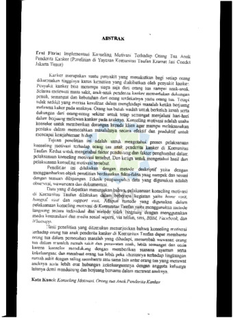 Kanker merupakan suatu penyakit yang menakutkan bagi setiap orang dikarenakan tingginya kasus penyakit yang diakibatkan oleh penyakit kanker. Penyakit kanker bisa menimpa semua usia dari orang tua sampai anak-anak. Selama melewati masa sakit, anak-anak penderita kanker memerlukan dukungan penuh, semangat dan kebutuhan akan keluarga serta orang tua yang tulus. Tetapi tidak sedikit yang merasa kesulitan dalam menghadapi masalah ketika berjuang melawan kanker pada anaknya. Orang tua buku wdah untuk bekuk kesehatan serta dukungan dari orang-orang sekitar untuk tetap semangat menjalani hari-hari beluam berjuang melawan kanker pada anaknya. Konseling motivasi adalah usaha konselor untuk memberikan dorongan kepada klien agar mampu melaksanakan prlilaku dalam mencegah masalahnya secara efektif dan produktif untuk mencapai kesejahteraan hidup. Tujuan penelitian ini adalah untuk mengetahui proses pelaksanaan konseling motivasi terhadap orang tua anak penderita kanker di Komunitas Taufan. Kedua untuk mengetahui faktor pendukung dan faktor penghambat dalam pelaksanaan konseling motivasi tersebut. Data juga untuk mengetahui hasil dari pelaksanaan konseling motivasi tersebut. Pelaksanaan ini dilakukan dengan metode deskriptif yaitu dengan menggambarkan objek penelitian berdasarkan fakta-fakta yang nampak dan sesuai dengan temuan dilapangan. Teknik pengumpulan data yang digunakan adalah observasi, wawancara dan dokumentasi. Data yang didapatkan menunjukkan bahwa pelaksanaan konseling motivasi di Komunitas Taufan dilakukan dalam beberapa kegiatan yaitu home visit, kunjungi visit dan support visit. Adapun metode yang digunakan dalam pelaksanaan konseling motivasi di Komunitas Taufan yaitu menggunakan metode langsung secara individual dan demo; tidak langsung dengan menggunakan media komunikasi dan media sosial seperti, via telpon, sms, BBM, Facebook, dan Whatsapp. Hasil penelitian yang ditemukan menunjukkan bahwa konseling motivasi terhadap orang tua anak penderita kanker di Komunitas Taufan dapat membantu orang tua dalam pencegahan masalah yang dihadapi, menambah wawasan orang tua dalam masalah rumah sakit dan perawatan anak, lebih semangat dan ceria karena konselor mendukung dengan memberikan, susasana nyaman dan nyaman serta kekeluargaan dan membuat orang tua lebih peka khususnya terhadap lingkungan rumah sakit dengan saling membantu satu sama lain antar orang tua yang menangraw anaknya serta lebih erat hubungan kekeluargaannya dengan anggota keluarga lainnya demi memberi dan bervangk dengan bersungguh dalam merawat anaknya.