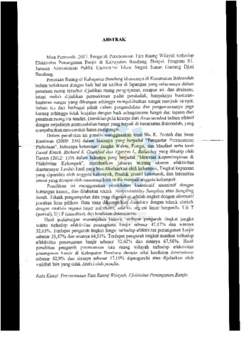 INDONESIA Penataan Ruang di Kabupaten Bandung khususnya di Kecamatan Baleendah belum terlaksana dengan baik hal ini terletak di dapatan yang sengaja dalam penataan ruang tersebut dijadikan rangkaian penghijauan, resapan air dan drainase, penataan ruang tersebut dijadikan rangkaian pada pendahulu, banyaknya bantaran-bantaran sungai yang dibangun sehingga mengganggu susai menjadi sempit. Selain itu dari berbagai pihak dalam pengendalian dan pengawasan nya juga kurang sehingga tidak berjalan dengan baik sebagaimana fungsi di tuju dan tujuan dari penataan ruang itu sendiri. Demikian pula kinerja dari dana tersebut belum efektif dengan terjadinya permasalahan banjir yang terjadi di kecamatan Baleendah, yang menyebabkakan masyarakat harus mengungsi. Dalam penelitian ini penulis menggunakan teori Nia K. Pontoh dan Iwan Kustiwain (2009: 336) dalam bukunya yang berjudul "Pengantar Perencanaan Perkotaan", beberapa ketentuan: Jangka Waktu, Fungsi, dan Manfaat serta teori David Krech, Rischard S. Crufield dan Egerton L. Ballachey yang dikutip oleh Danim (2012: 119) dalam bukunya yang herjudi "Motivasi Kepemimpinan dan Efektivitas Kelompok", membcarkan jabaran tentang ukuran efektivitas dilantarnya. Jumlah hasi yang bisa diberikan oleh kelompok, Tingkat kepercayaan yang diperoleh oleh anggota kelompok, Produk kretikal keelnopan, dan Intenitas emosi yang dicapai oleh seseorang karena di menjadi anggota kelompok. Penelitian ini menggunakan pendekatan kuantitatif associative dengan hubungan kausal, dan dilakukan teknik Nonprobability Sampling atau Saturated Sampling. ENGLISH Hasil, Ttknik pengumpulan data yang digunakan adalah angket dengan alternatif jawaban lima pilihan. Data yang dikumpulkan dianalisis dengan tknik statistik dengan analisis regresi linier sederhana, analisis regresi linier berganda, Uji T (parsial), Uji F (simonultan), dan koefisien determinasi. The result of calculation shows that there is influence of time period to effectively of flood handling 47.17% and the remaining 52.83%. The effect of functional level vs effectiveness of flood handling is 35.47% and the remaining 64.53%. There is also influence of the level of benefits to the effectiveness of flood handling of 32.42% and the remaining 67.58%. The result of research influence of spatial planning of area to effectiveness of flood handling in Bandung Regency with coefficient of determination equal to 82.9% and the remaining 17.19% influenced or explained by other variable not identified by the author.