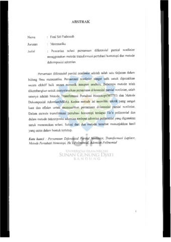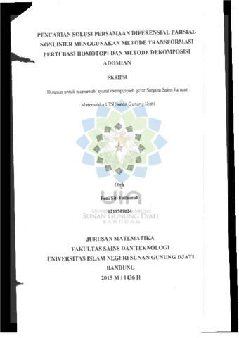 Fathonah, Feni Siti (2015) Pencarian solusi persamaan diferensial parsial monlinier menggunakan metode transformasi pertubasi homotopi dan metode dekomposisi adomian. Sarjana thesis, UIN Sunan Gunung Djati Bandung.