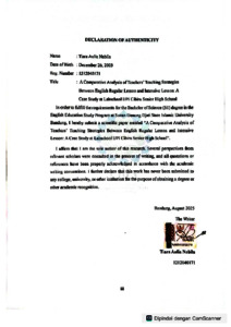 Nabila, Tiara Aulia (2025) A comparative analysis of teachers’ teaching strategies between english Regular Lesson and Intensive Lesson: a case study at Labschool UPI Cibiru Senior High School. Sarjana thesis, UIN Sunan Gunung Djati Bandung.