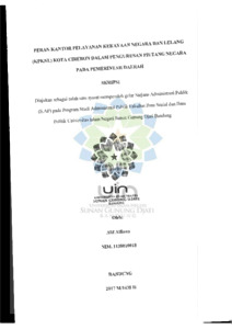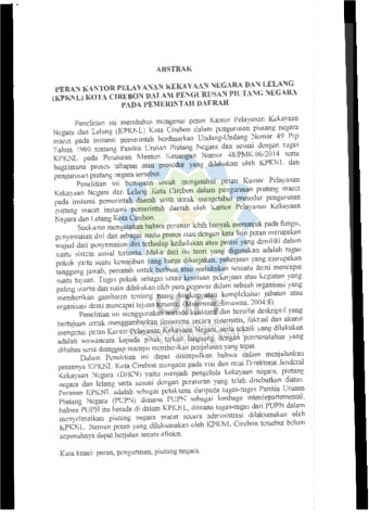 Penelitian ini membahas mengenai peran Kantor Pelayanan Kekayaan Negara dan Lelang (KPKNL) Kota Cirebon dalam pengurusan piutang negara pada instansi pemerintah berdasarkan Undang-Undang Nomor 49 Ppr tahun 1960 tentang Penitunan Urusan Negara dan sesuai dengan tugas KPKNL pada Peraturan Pemerintah Keuangan Nomor 48/PMK.06/2014 serta bagaimana proses tahapan atau prosedur yang dilakukan oleh KPKNL dan pengurusan piutang negara tersebut. Penelitian ini bertujuan untuk mengetahui peran Kantor Pelayanan Kekayaan Negara dan Lelang Kota Cirebon dalam pengurusan piutang negara pada instansi pemerintah daerah serta untuk mengetahui prosedur pengurusan piutang negara instansi pemerintah daerah oleh Kantor Pelayanan Kekayaan Negara dan Lelang Kota Cirebon. Sementara pengetahuan bahwa peranan lebih banyak menunjuk pada fungsi, penyesuaian diri dan sebagai suatu proses atau kegiatan lain peran merupakan wujud dari penyesuaian diri terhadap kedudukan atau posisi yang dimiliki dalam suatu sistem sosial tertentu. Maka dari itu toy dengan digunakan adalah tugas pokok yaitu suatu kewajiban yang harus dikerjakan, pekerjaan yang merupakan tanggung jawab, perintah untuk berat atau melakukan sesuatu dan mencapainya satu tujuan. Ugas pokok sebagai satu kecamatan pekerjaan atau kegiatan yang paling utama dan rutin dilakukan oleh para pegawai dalam sebuah organisasi yang memberikan gambaran tentang tugas di lingkungan atau kompleksitas jabatan atau organisasi demi mencapai tujuan tertentu. (Muammar Himawan, 2004:8). Penelitian ini menggunakan metode kualitatif dan bersifat deskriptif yang bertujuan untuk menggambarkan fenomena secara sistematis, faktual dan akurat mengenai peran Kantor Pelayanan Kekayaan Negara, serta teknik yang dilakukan adalah wawancara kepada pihak terkait langsung, dengan permasalahan yang dibahas serta dianggap mampu memberikan penjelasan yang tepat. Dalam Penelitian ini dapat disimpulkan bahwa dalam menjalankan perannya KPKNL Kota Cirebon memberi padu visi dan misi Direktorat Jenderal Kekayaan Negara (DJKN) yaitu menjadi pengelola kekayaan negara, piutang negara dan lelang serta sesuai dengan peraturan yang telah disebutkan diatas. Peranan KPKNL adalah sebagai pelaksana daripada tugas-tugas Panitia Urusan Piutang Negara (PUPN) dimana PUPN sebagai lembaga interdepartemental, bahwa PUPN itu berada di dalam KPKNL, dimana tugas-tugas dari PUPN dalam menyelesaikan piutang negara makin secara administratif dilaksanakan oleh KPKNL. Namun peran yang dilaksanakan oleh KPKNL Cirebon tersebut belum sepenuhnya dapat berjalan secara efisien.