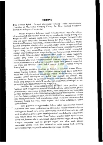 Dalam masyarakat Indonesia masih memiliki tradisi yang selalu dijaga oleh masyarakat dari semenjak nenek moyang mereka, dan masing-masing suku bangsa memiliki jenis dan bentuk tradisi yang beraneka ragam. Termasuk tradisi yang ada dalam masyarakat Kampung Karang Sari Desa Citalang Kecamatan Purwakarta Kabupaten Purwakarta, yaitu memiliki tradisi ngawaladon. Tradisi tersebut merupakan sebuah tradisi yang dilaksanakan dalam memperingati hari kematian pada hari ke-8 sebagai memberikan barang-barang yang dimiliki jenazah kepada orang yang memandikan jenazah. Dalam sebuah tradisi, masyarakat menjadi unsur penting karena masyarakatlah yang berperan dalam melestarikan sebuah tradisi. Selain itu dalam pelestarian sebuah tradisi, tergantung bagaimana persepsi yang timbul dari masyarakat terhadap tradisi tersebut. Tujuan penelitian ini ialah untuk mengetahui sejarah munculnya tradisi ngawaladon, proses pelaksanaan, serta makna simbolis dalam tradisi serta persepsi masyarakat dan tokoh adat terhadap adanya tradisi tersebut di Desa Citalang Kampung Karang Sari. Kerangka pemikiran penelitian ini didasarkan pada teori Herbert Blumer tentang Interaksi Simbolik, dimana inti pemikirannya bahwa dalam masyarakat terdiri dari 3 hal yaitu makna, persepsi dan simbol. Selain itu setiap masyarakat memiliki sebuah kebudayaan dan tradisi yang menjadi ciri simbolik bagi masyarakatnya. Selain itu masyarakat menjadi unsur penting dalam pelestarian tradisi yang menjadi ciri simbolik mereka serta menimbulkan berbagai macam persepsi terhadap adanya tradisi dalam masyarakat. Penelitian ini menggunakan metode deskriptif, yaitu penelitian yang bertujuan untuk menggambarkan sejarah munculnya tradisi ngawaladon, proses pelaksanaannya dan makna simbolis tradisi serta menggambarkan bagaimana persepsi dari masyarakat dan tokoh adat terhadap adanya tradisi tersebut. Adapun jenis data dalam penelitian ini ialah jenis data kualitatif dan yang menjadi sumber data dalam penelitian ini ialah sesepuh masyarakat, tokoh adat serta masyarakat Kampung Karang Sari yang selalu berperan aktif dalam pelaksaaan tradisi ngawaladon. Hasil penelitian menggambarkan bahwa tradisi ngawaladon berawal pada tahun 1961. Proses pelaksanaannya dilaksanakan selama delapan hari pasca meninggalnya jenazah serta makna simbolis yang diyakini dalam tradisi ini ialah untuk memberikan pakaian ganti kepada jenazah di alam kuburnya serta persepsi yang muncul dalam masyarakat Desa Citalang terhadap tradisi ngawaladon cukup baik, karena tradisi tersebut masih tetap dilestarikan hingga sekarang. Bagi sebagian masyarakat memiliki persepsi negatif atau sikap acuh, dimana masyarakat tersebut sudah tidak menikmati tradisi namun tidak melarang masyarakat lainnya yang masih melestarikannya hingga sekarang.