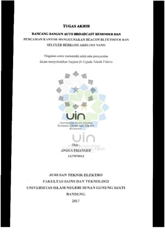 Priangger, Angga (2017) Rancang bangun auto broadcast reminder dan pengaman kantor menggunakan beacon Bluetooth dan seluler berbaris Arduino nano. Sarjana thesis, UIN Sunan Gunung Djati Bandung.