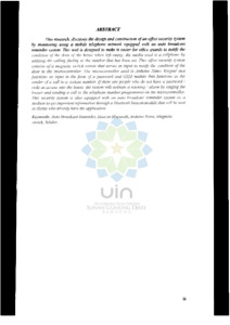 This research, discusses the design and construction of an office security system by monitoring using a mobile telephone network equipped with an auto broadcast reminder system. This task is designed to make it easier for office guards to notify the condition of the door or the house when left empty. The media used is a cellphone by utilizing the calling facility to the number that has been set. This office security system consists of a magnetic switch sensor that serves as input to notify the condition of the door to the microcontroller. The microcontroller used is Arduino Nano. Keypad that functions as input in the form of a password and GSM module that functions as the sender of a call to a certain number. If there are people who do not have a password / code as access into the house, the system will activate a warning alarm by ringing the buzzer and sending a call to the telephone number programmed on the microcontroller. This security system is also equipped with an auto broadcast reminder system as a medium to get important information through a Bluetooth beacon module that will be sent to clients who already have the application.