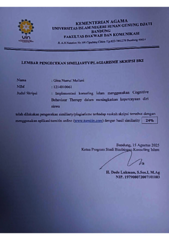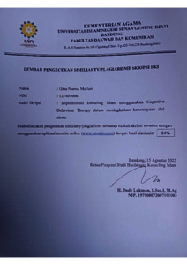 Meilani, Gina Nurrul (2025) Implementasi konseling Islam menggunakan cognitive behaviour therapy dalam meningkatkan kepercayaan diri siswa. Sarjana thesis, UIN Sunan Gunung Djati Bandung.