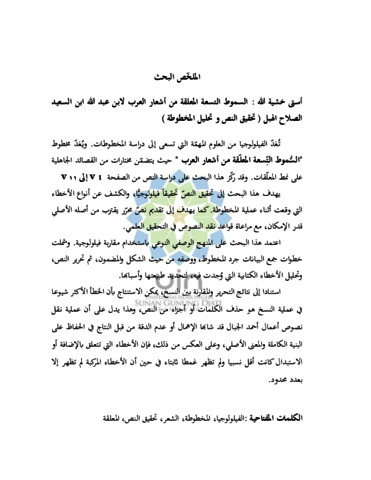 INDONESIA: Kajian filologi merupakan bidang yang berperan penting dalam meneliti dan menghidupkan kembali warisan intelektual masa lampau, khususnya melalui naskah-naskah kuno. Salah satu karya yang menjadi fokus dalam penelitian ini adalah as-Sumût at-Tis'ah al-Mu'allaqah min Asy'är al-'Arab, sebuah naskah yang berisi syair-syair klasik Arab dalam bentuk mu'allaqat. Penelitian difokuskan pada kajian teks dari halaman 1v hingga 11v. Tujuan dari penelitian ini adalah untuk menyunting teks secara filologis dan mengidentifikasi bentuk-bentuk kesalahan penyalinan yang terjadi dalam naskah. Selain itu, penelitian ini juga bertujuan untuk menyajikan teks hasil suntingan yang lebih dapat dipertanggungjawabkan secara akademik, serta mendekati bentuk aslinya berdasarkan prinsip-prinsip kritik teks. Penelitian ini menggunakan metode deskriptif kualitatif dengan pendekatan filologi. Teknik pengumpulan data meliputi inventarisasi naskah, deskripsi fisik dan isi naskah, penyuntingan teks, serta analisis bentuk-bentuk kesalahan penyalinan yang ditemukan dalam naskah. Berdasarkan hasil penyuntingan dan perbandingan antar naskah, dapat disimpulkan bahwa kesalahan penyalinan yang paling dominan adalah penghilangan kata atau bagian teks. Hal ini mengindikasikan bahwa proses transmisi teks karya Ahmad al-Habal cenderung diwarnai oleh kelalaian atau ketidaktelitian penyalin dalam mempertahankan keseluruhan struktur dan makna asli. Sebaliknya, kesalahan berupa penambahan atau penggantian kata relatif lebih sedikit dan tidak menunjukkan pola yang konsisten, sementara kesalahan gabungan hanya muncul dalam jumlah terbatas. ENGLISH: Philological studies play a crucial role in examining and reviving the intellectual heritage of the past, particularly through ancient manuscripts. One of the works that serves as the focus of this research is As-Sumūṭ al-Tis‘ah al-Mu‘allaqah min Ash‘ār al-‘Arab, a manuscript containing classical Arabic poetry in the form of mu‘allaqāt. This study concentrates on the textual examination of folios 1v to 11v. The purpose of this research is to produce a philological edition of the text and to identify the types of scribal errors found within the manuscript. Furthermore, it aims to present an academically accountable edited version of the text, one that closely approximates its original form based on the principles of textual criticism. This research employs a qualitative descriptive method with a philological approach. The techniques of data collection include manuscript inventory, physical and content description of the manuscript, textual editing, and analysis of the types of scribal errors identified within the text. Based on the results of the editing process and the comparison between manuscripts, it can be concluded that the most dominant scribal error is the omission of words or portions of the text. This indicates that the transmission of Ahmad al-Habal’s work was largely affected by scribes’ negligence or inaccuracy in preserving the text’s overall structure and original meaning. In contrast, errors in the form of additions or substitutions of words occur less frequently and do not display a consistent pattern, while combined errors appear only in a limited number. ARABIC: استی خشية الله : السموط التسعة المعلقة من أشعار العرب لابن عبد الله ابن السعيد الصلاح الهبل ( تحقيق النص و تحليل المخطوطة ) العلم الفيلولوجيا من العلوم المهمة التي تسعى إلى دراسة المخطوطات، ويعد مخطوط السموط التسعة المعلقة من أشعار العرب " حيث يتضمن مختارات من القصائد الجاهلية على نمط المعلقات، وقد ركز هذا البحث على دراسة النص من الصفحة ١ v إلى ١١ v يهدف هذا البحث إلى تحقيق النص تحقيقاً فيلولوجيا، والكشف عن أنواع الأخطاء التي وقعت أثناء عملية المخطوطة، كما يهدف إلى تقديم نص محرر يقترب من أصله الأصلي قدر الإمكان، مع مراعاة قواعد نقد النصوص في التحقيق العلمي. اعتمد هذا البحث على المنهج الوصفي النوعي باستخدام مقاربة فيلولوجية، وشملت خطوات جمع البيانات جرد المخطوط، ووصفه من حيث الشكل والمضمون، ثم تحرير النص وتحليل الأخطاء الكتابية التي وجدت فيه، لتحديد طبيعتها وأسبابها. استنادا إلى نتائج التحرير والمقارنة بين النسخ، يمكن الاستنتاج بأن الخطأ الأكثر شيولها في عملية النسخ هو حذف الكلمات أو أجزاء من النص، وهذا يدل على أن عملية نقل نصوص أعمال أحمد الهبل قد شابها الإهمال أو عدم الدقة من قبل النساخ في الحفاظ على البنية الكاملة والمعنى الأصلي، وعلى العكس من ذلك، فإن الأخطاء التي تتعلق بالإضافة أو الاستبدال كانت أقل نسبيا ولم تظهر نمطا ثابتا في حين أن الأخطاء المركبة لم تظهر إلا بعدد محدود