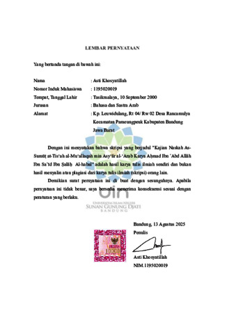 Khosyatillah, Asti (2025) Kajian naskah As-Sumūṭ at-Tis‘ah al-Mu‘allaqah min Asy‘ār al-‘Arab karya Aḥmad Ibn 'Abd Allāh Ibn Sa'īd Ibn Ṣalāḥ Al-habal. Sarjana thesis, UIN Sunan Gunung Djati Bandung.